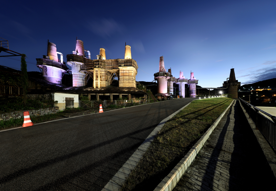 行驶过弯弯曲曲的盘山公路,考察团队的车子在傍晚时分抵达了位于矾山镇鸡笼山半山腰的矾山矾矿遗址,几座遗留的煅烧炉立在一轮圆月下,仿佛仍在平息往日的炽热,山下福德湾村亮起了浮游灯火,依稀能见到老街曲巷交错,房屋高低间杂,其中不少是保存下来的清末民国时期的传统民居、古街道。