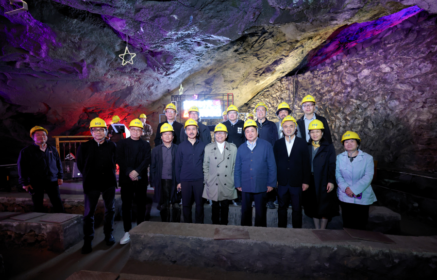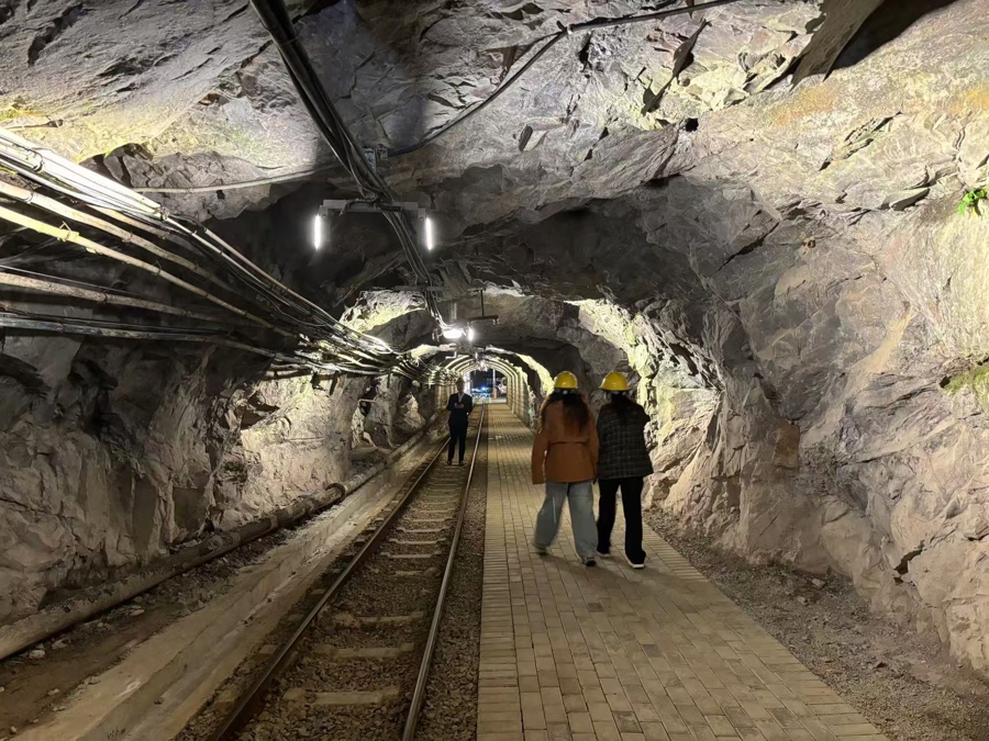 煅烧炉的背后停靠着一列小火车。过去工人们推着矿车将矿石运出矿洞,如今游客们沿着同一轨道,乘火车进入矿洞,逆向穿回“历史”。火车带着考察团队来到南洋312平硐,踏入硐口,仿佛进入一座纵横交错的山体迷宫,用当地人的话形容仿佛“一个巨大的10层核桃馅蛋糕”,硐室会议室、山体炮眼群等区域均被保留呈现,墙上的“为毛泽东思想……政治是灵魂是统帅……”等数句标语均为当时工人所手写,与硐室会议室中乐手们现场演奏的《咱们工人有力量》等歌曲叠加呼应,一下子将人拉回那个热火朝天的年代。